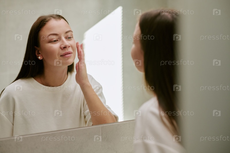 Молодая женщина прикасается к лицу, наслаждаясь утренней рутиной ухода за кожей