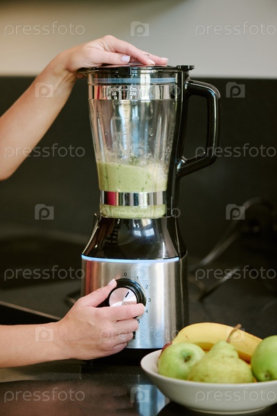 Молодая взрослая женщина смешивает зеленый смузи на кухне в течение утра