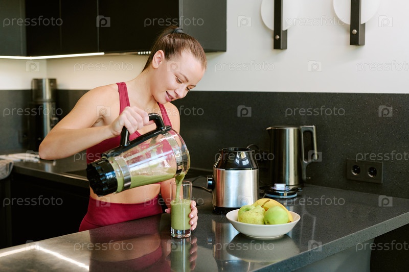 Молодая женщина наливает зеленый смузи в стакан во время утренней рутины