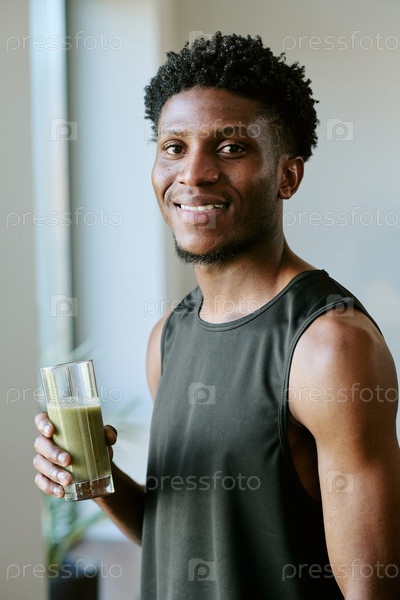 Портрет молодого взрослого чернокожего мужчины, улыбающегося в то время как он держит здоровый утренний смузи
