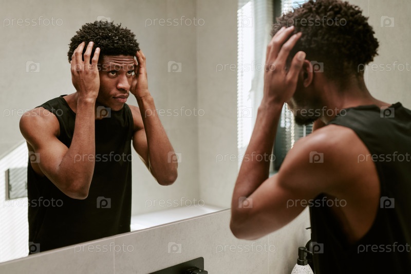 Молодой чернокожий мужчина ухаживает за волосами в зеркале ванной во время утренней рутины