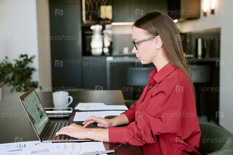 Молодая взрослая женщина работает на ноутбуке в современной кухне Morning Light