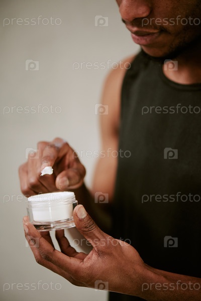 Молодой взрослый чернокожий мужчина наносит увлажняющий крем во время утренней рутины по уходу за кожей