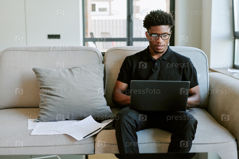 Молодой взрослый чернокожий мужчина работает на ноутбуке во время утра в домашней гостиной