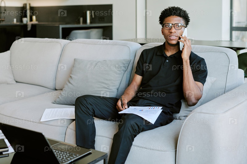 Молодой взрослый чернокожий мужчина сидит на диване и разговаривает со смартфоном в утреннем свете