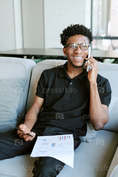 Молодой взрослый чернокожий мужчина улыбается, разговаривая со смартфоном в утреннем свете