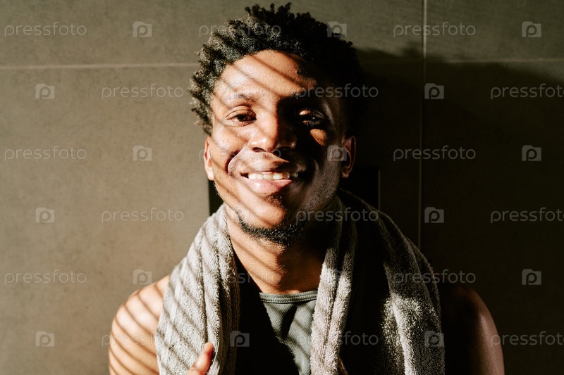 Портрет молодого взрослого чернокожего мужчины, улыбающегося на утреннем солнце в помещении