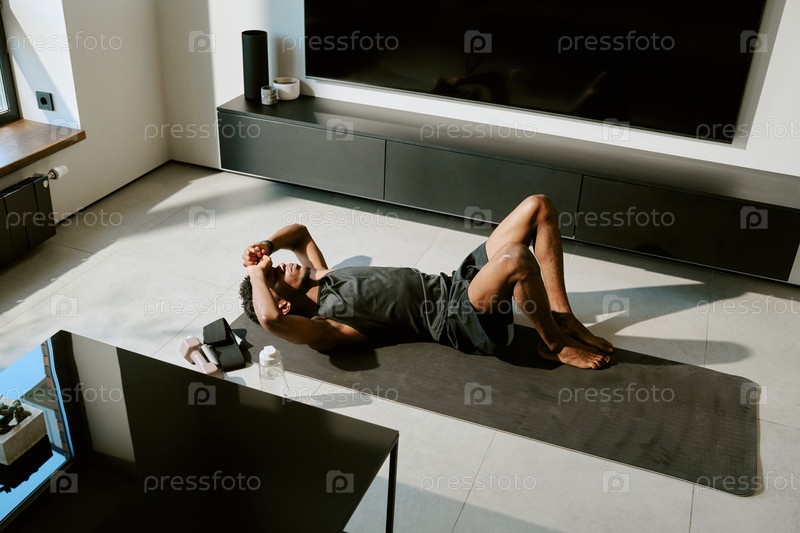 Молодой взрослый мужчина отдыхает после утренней тренировки на йога-матке в помещении