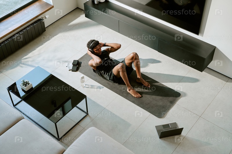 Молодой взрослый чернокожий мужчина занимается на йога-матке во время утренней домашней тренировки