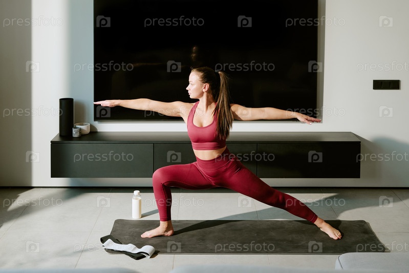 Молодая женщина практикует йогу, позируя в яркой современной гостиной