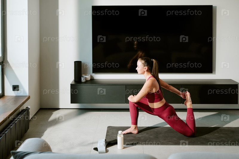 Молодая взрослая женщина растягивает квадрицепс во время утренней фитнес-практики