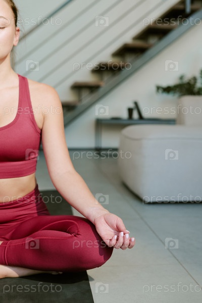 Молодая женщина медитирует в помещении во время мирной утренней рутины