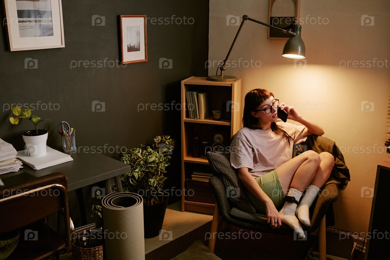 Молодая бирациальная женщина сидит дома, разговаривает по телефону и носит монитор на лодыжке