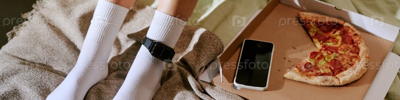 Женщина, которая носит монитор лодыжек, сидит в помещении и ест пиццу