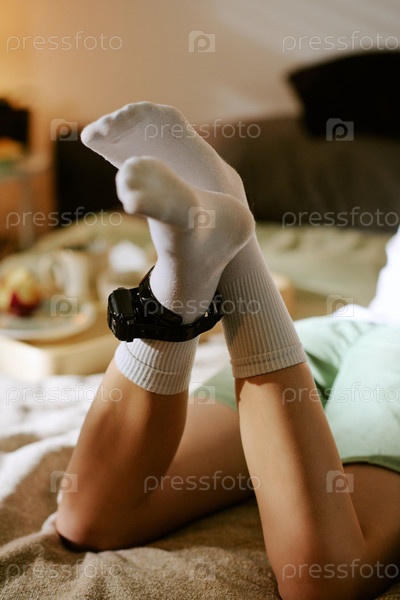Ноги женщины, отдыхающей на кровати, носящей электронный монитор лодыжки