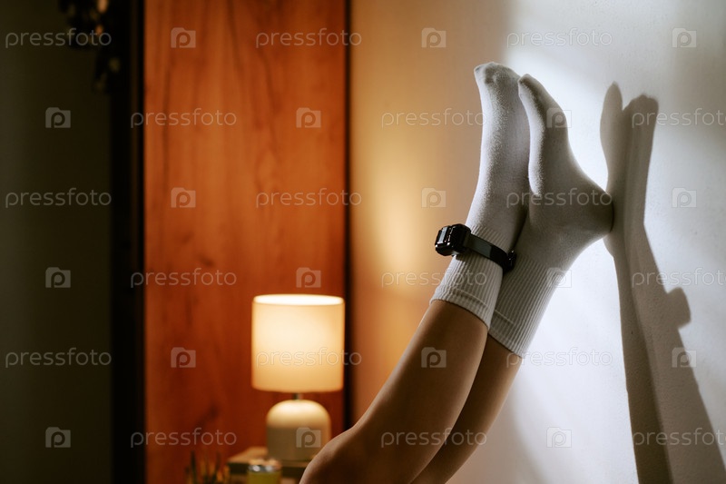 Женщина, отдыхающая ногами на стене, которая носит устройство для мониторинга лодыжек