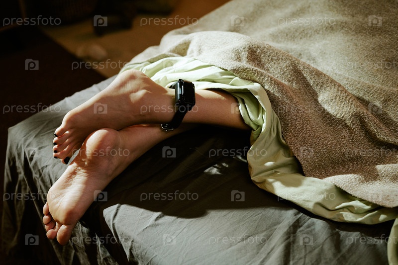 Женщина, отдыхающая в постели, носящая электронный монитор лодыжки