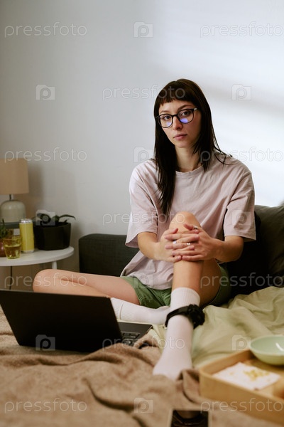 Портрет молодой взрослой бирациальной женщины, сидящей дома с монитором на лодыжке