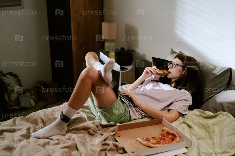 Молодая бирациальная женщина отдыхает дома, носит монитор лодыжек и ест пиццу