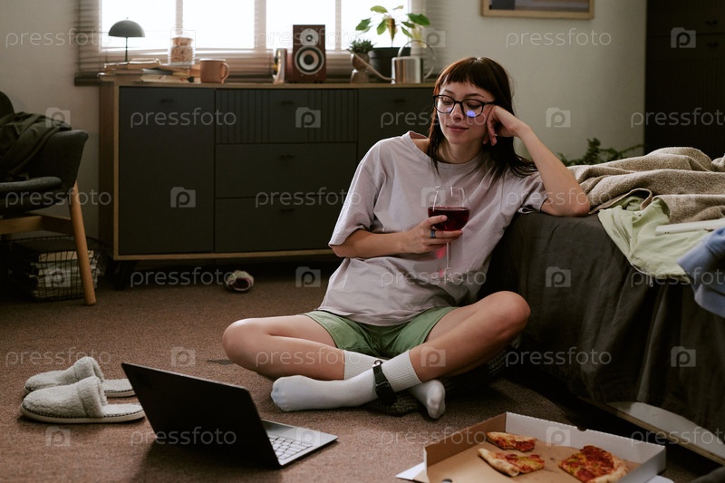 Молодая бирациальная женщина сидит в помещении, носит монитор лодыжек и пьет вино