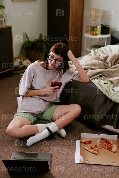 Молодая бирациальная женщина сидит дома, носит монитор на лодыжке и пьет вино