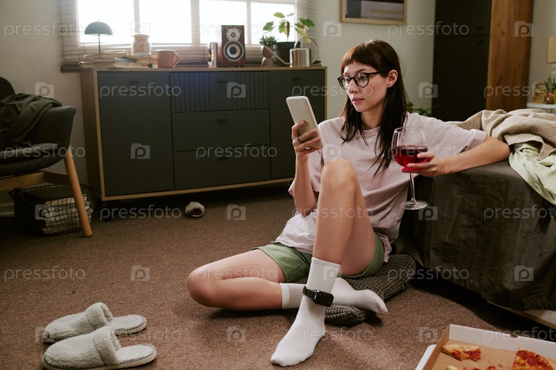 Молодая бирациальная женщина сидит дома, носит монитор на лодыжке и использует смартфон