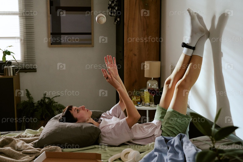 Молодая бирациальная женщина расслабляется дома, нося монитор лодыжек на кровати