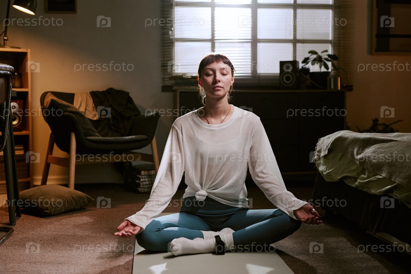 Молодая бирациальная женщина медитирует в помещении, нося прибор для мониторинга лодыжек