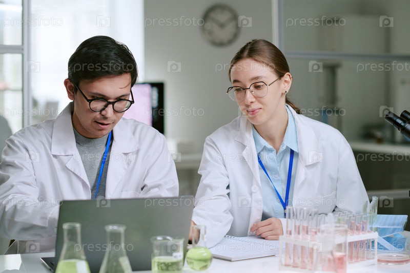 Молодая женщина и молодой человек сотрудничают в медицинских исследованиях в лаборатории
