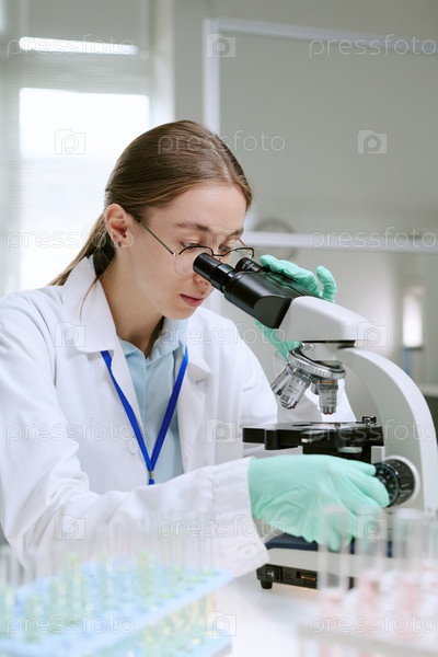 Молодая взрослая женщина изучает образцы под микроскопом в лаборатории