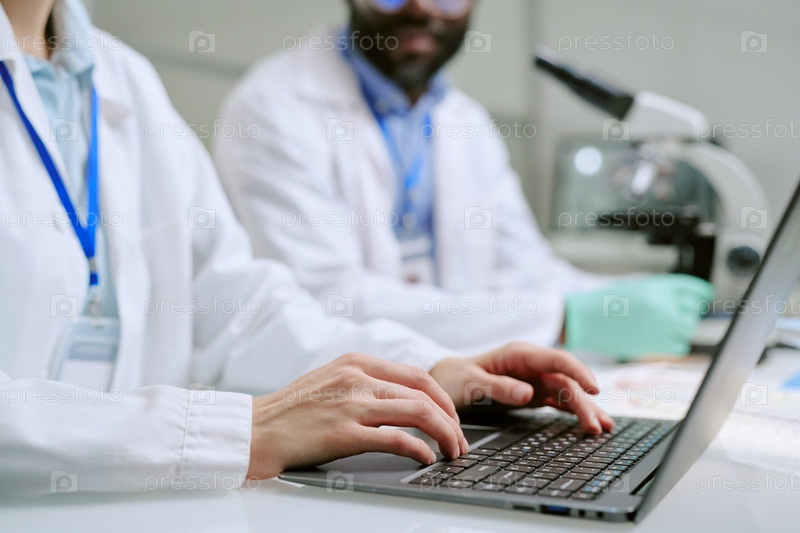 Женщина работает на ноутбуке рядом с мужчиной среднего возраста в лаборатории