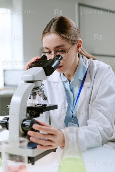 Молодая взрослая женщина наблюдает за биологическим образцом с помощью лабораторного микроскопа