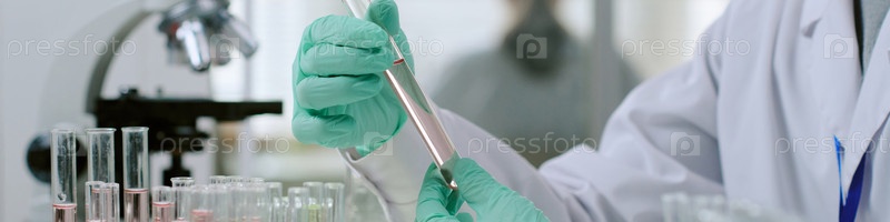 Заголовок с Ученый, передающий жидкость с помощью пипетки в лаборатории