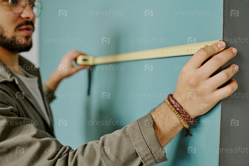 Молодой взрослый мужчина измеряет стену во время ремонта дома