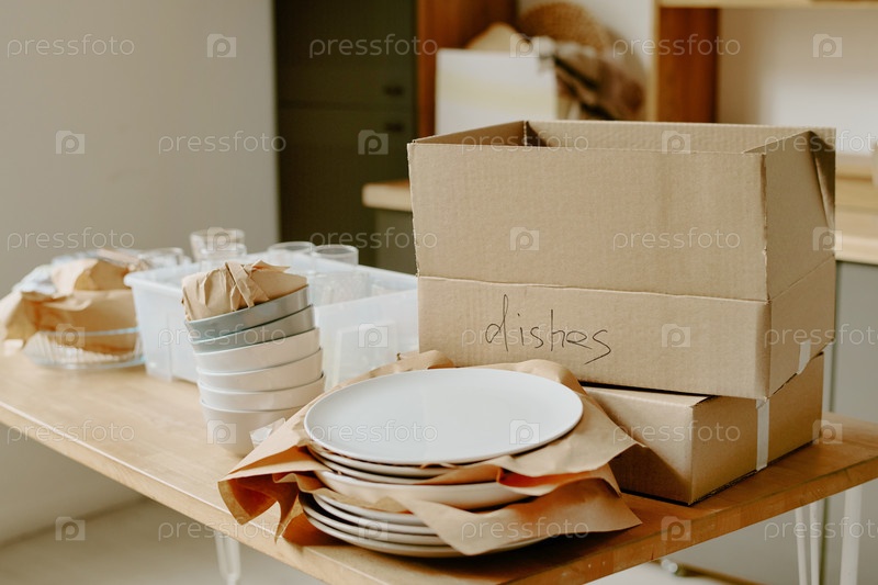 Куча тарелок и мисок, упакованных для перемещения во время переезда молодой пары