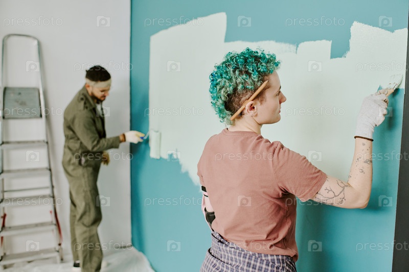 Молодая пара рисует стену во время совместного ремонта нового дома