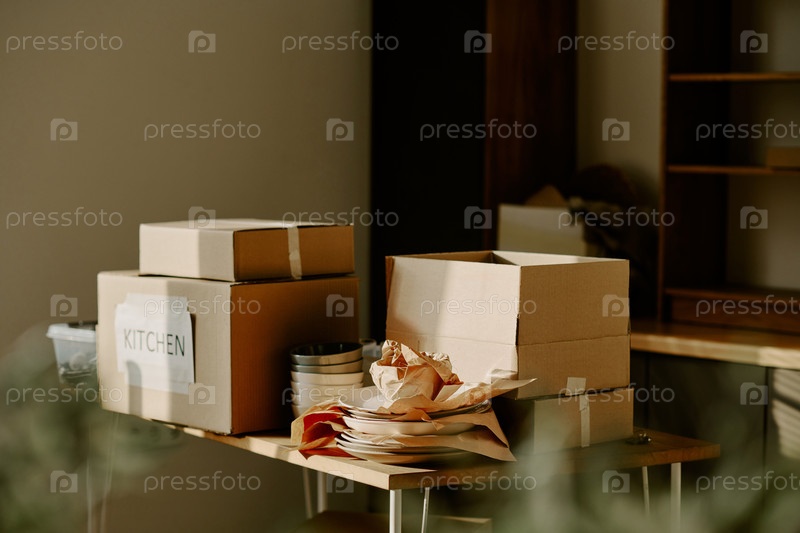 Картонные коробки и кухонная посуда упакованы для перемещения во время ремонта дома