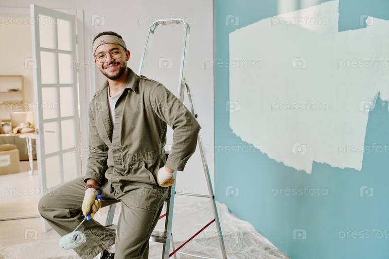 Портрет молодого человека, улыбающегося при покраске стены во время реконструкции