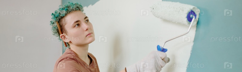 Заголовок женщины с кудрявыми волосами, рисующая стену во время переезда