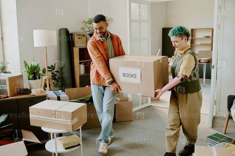 Молодая мультиэтническая пара, несущая коробки во время переезда и ремонта квартиры