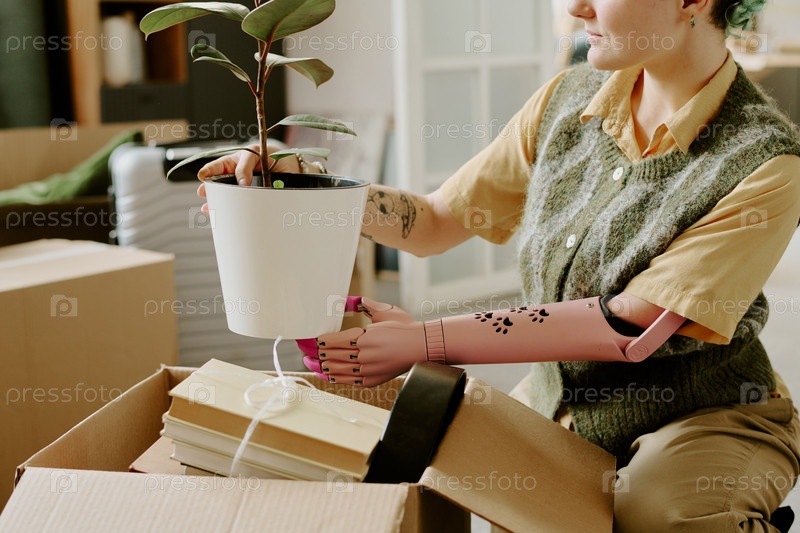Молодая взрослая женщина с протезируемой рукой расфасовывает растение во время переезда