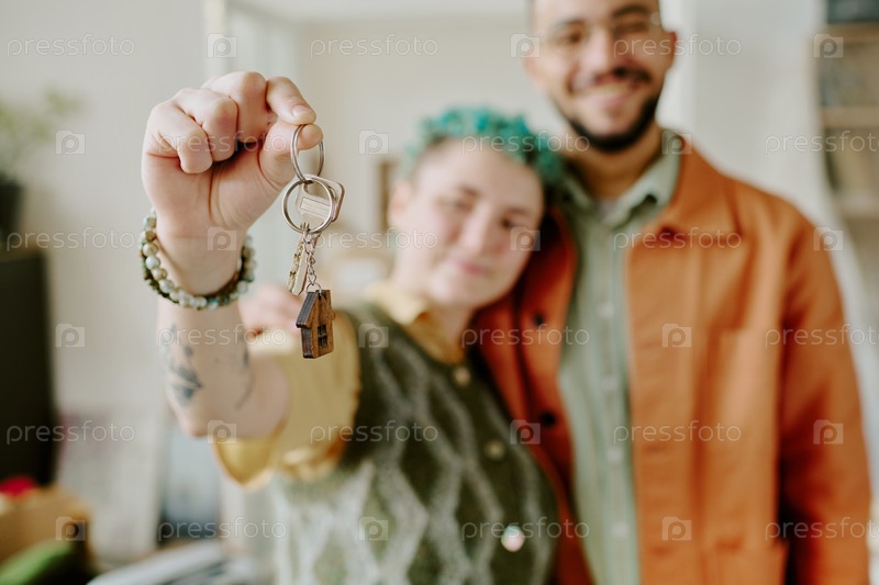 Молодая мультиэтническая пара улыбается, держа ключи после переезда домой