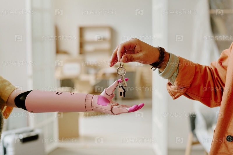 Женщина с протезированной рукой получает ключи во время переезда в новый дом