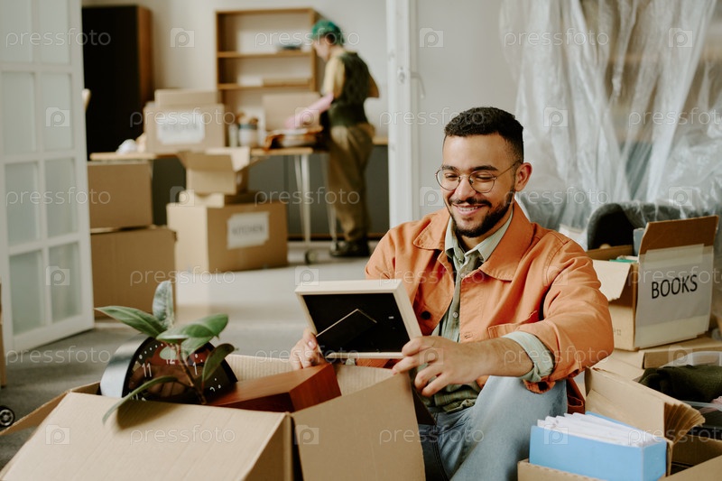Молодой человек улыбается, когда распаковывает коробки во время ремонта дома
