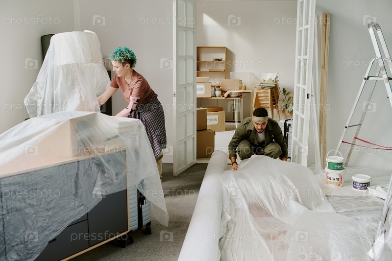 Молодая женщина и молодой человек готовятся к комнате во время ремонта дома