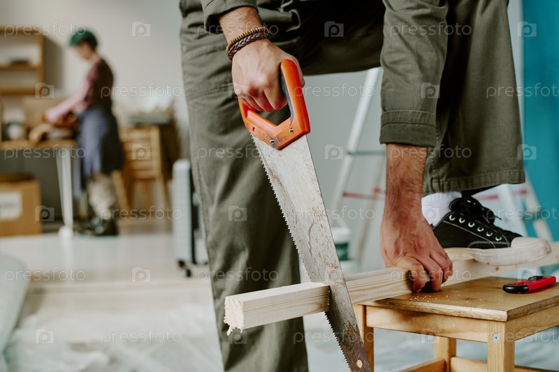 Мужчина сажает древесину, пока партнер ремонтирует квартиру