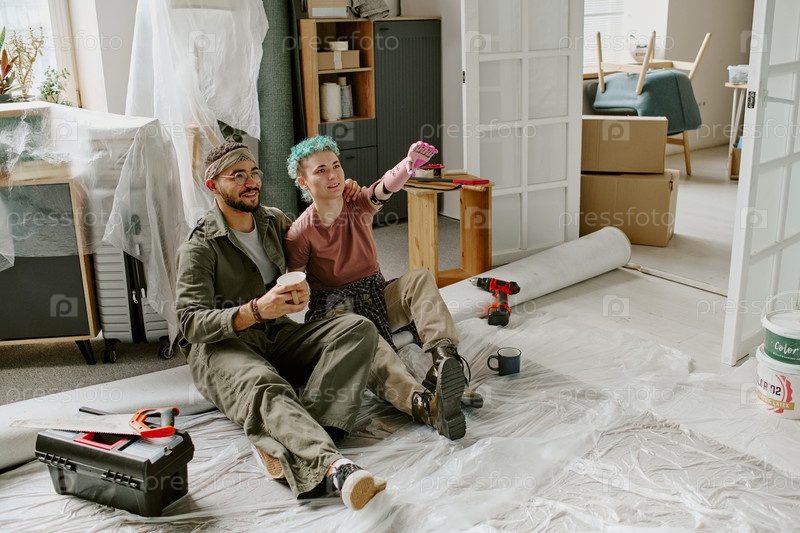 Молодая пара, сидящая на полу и пьющая кофе во время реконструкции