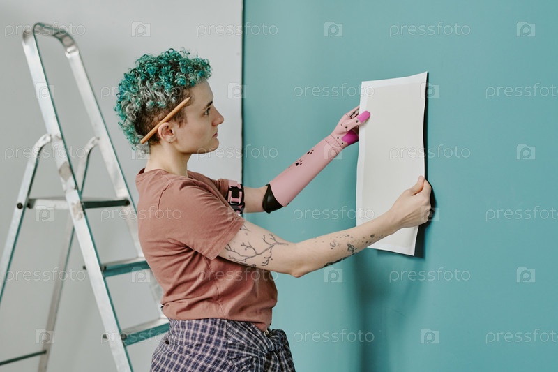 Молодая взрослая женщина с протезируемой рукой, висящей на плакате во время реконструкции