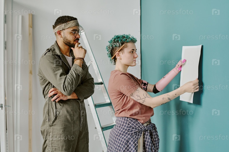 Женщина с протезируемой рукой висящий плакат с молодым мужчиной