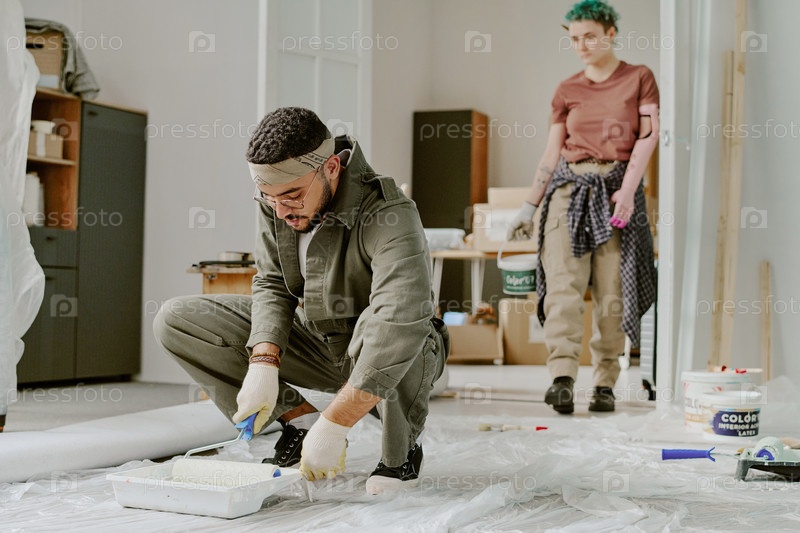 Молодая пара рисует стены во время совместного ремонта нового дома